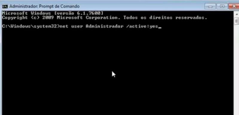 Após aberto digite comando net user Administrador /active:yes e de ENTER.