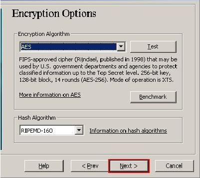 Aqui você pode escolher um algoritmo de criptografia e um algoritmo de criptografia( Hash) para o volume. Se você não está seguro do que selecionar aqui, você pode usar as pré-colocadas e clicar NEXT (para mais informação, veja Algoritmos de criptografia de capítulos e algoritmos de Hash).